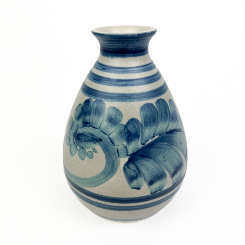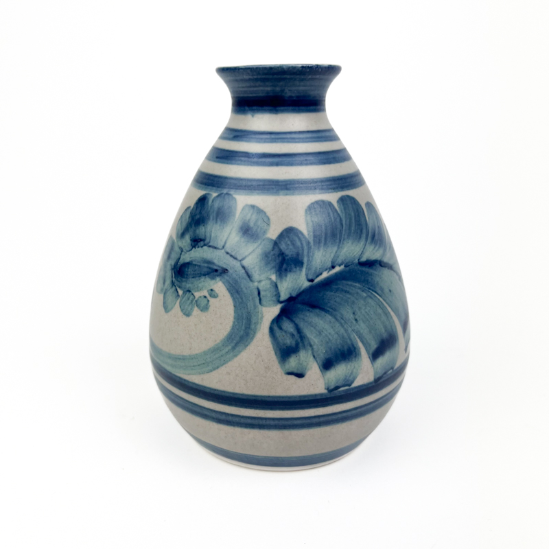 Vasen er udført i stentøj med klassisk rund form, smal hals og karakteristiske penselstrøg i blå nuancer.