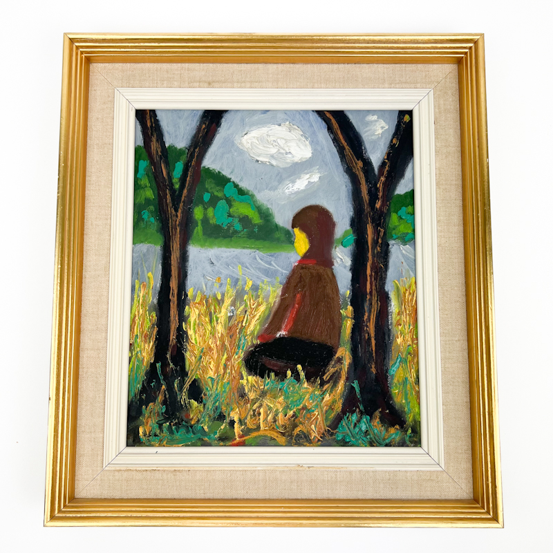 Motiv med figur ved sø omgivet af træer i et ekspressivt og farverigt udtryk.