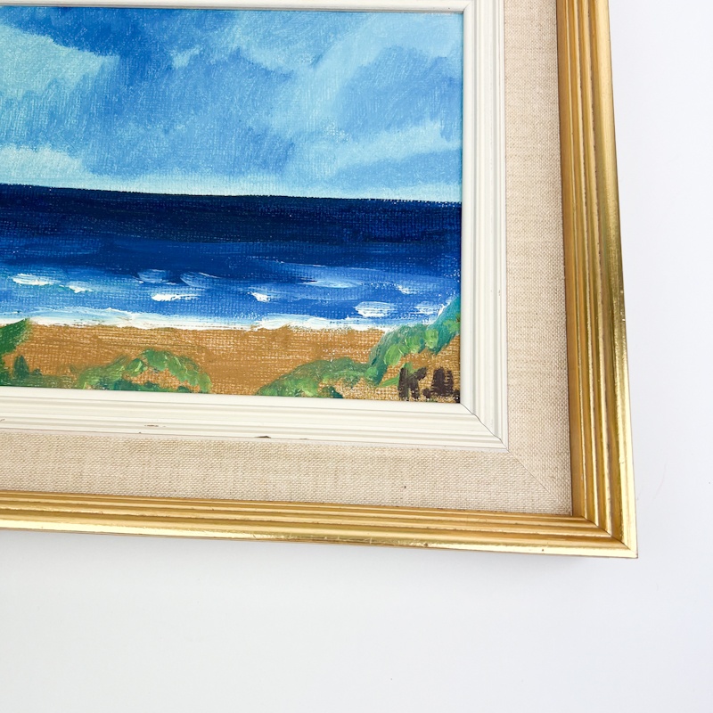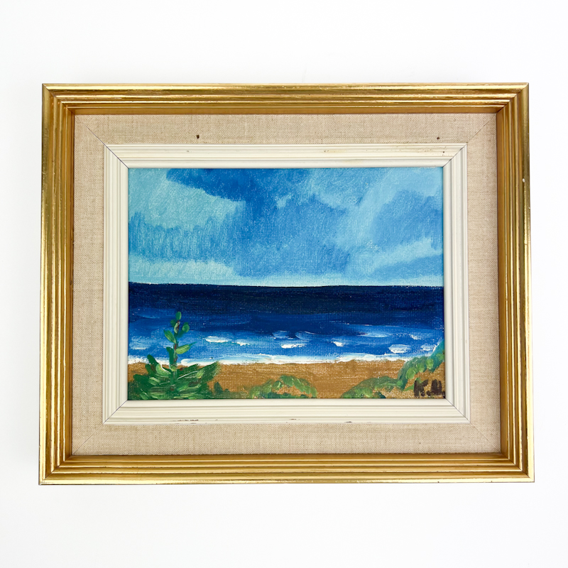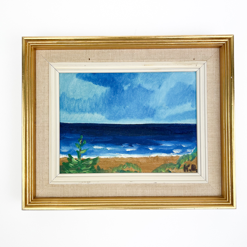 Originalt vintage maleri udført i akryl på lærred med roligt havmotiv og klare blå nuancer.