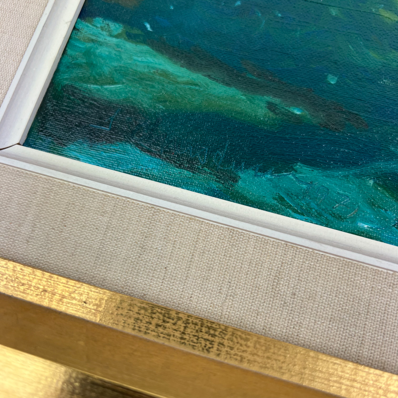 Indrammet i gylden træramme med lys passepartout, som giver en flot helhed.