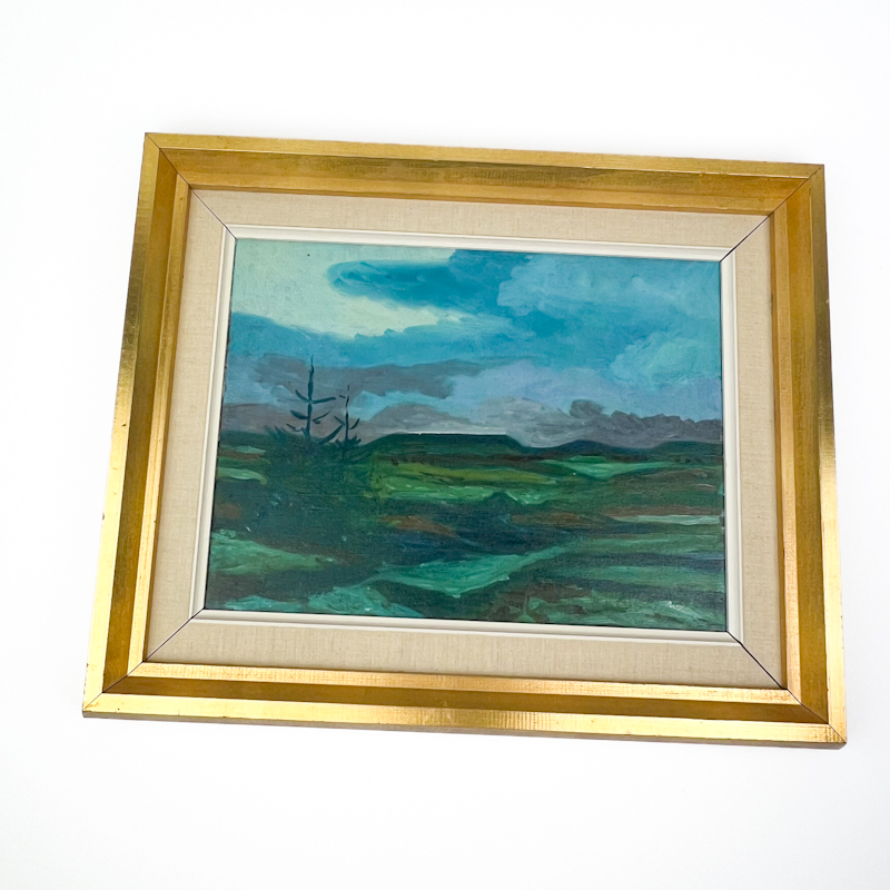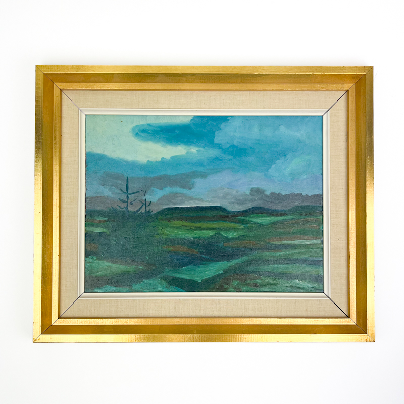 Enkel og stemningsfuld komposition med åbent landskab og lav horisont.