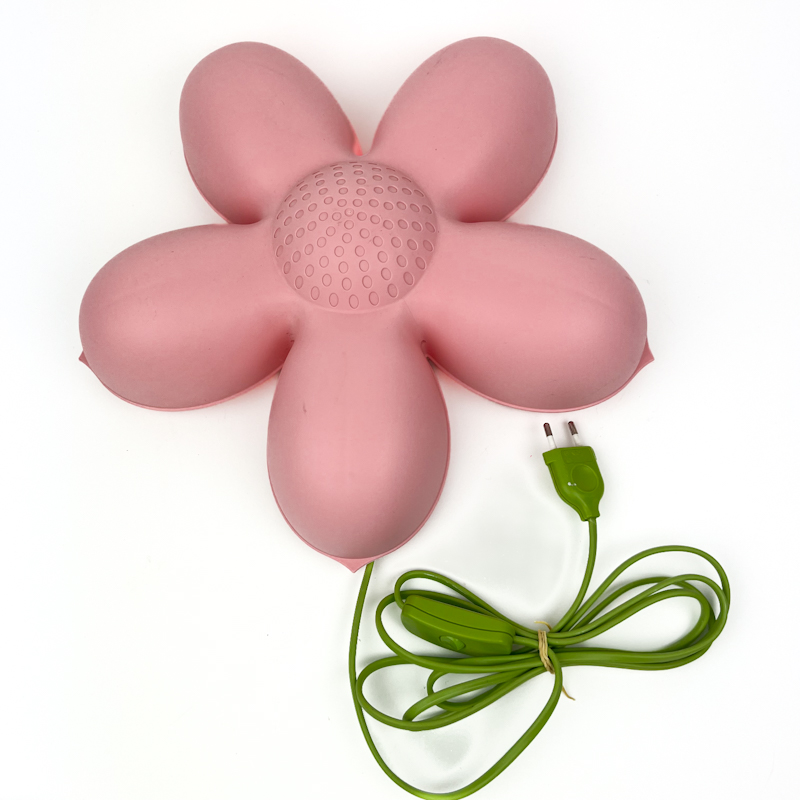 Fin væglampe fra IKEA formet som blomst i rosa plast med grøn ledning.