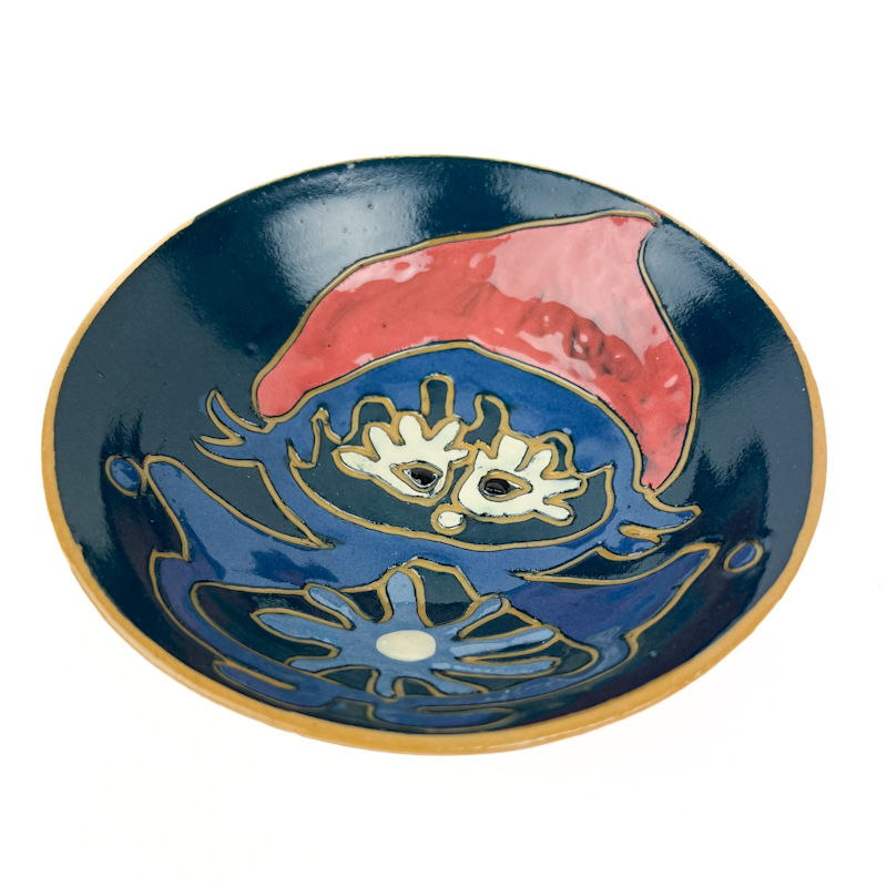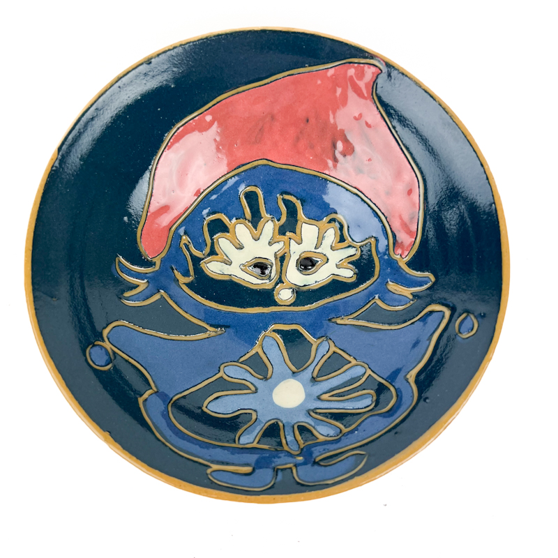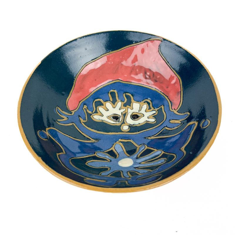 Udført i stentøj med farverig håndmalet dekoration i blå, grøn og rød med karakteristisk figurmotiv.