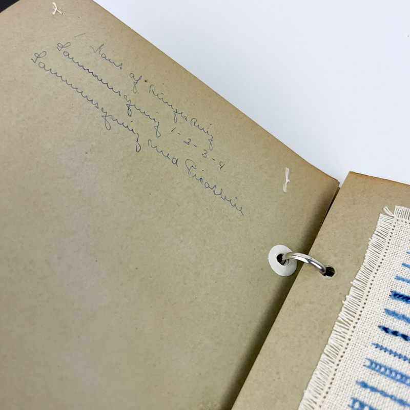 Indeholder mange forskellige teknikker udført som smukt gammelt håndarbejde, monteret på kartonark i ringbind.
