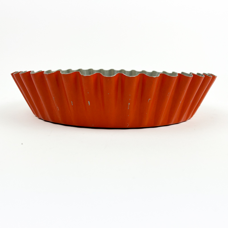 Flot retro tærteform i metal med varm orange overflade. Klassisk form med bølget kant fra midten af det 20. århundrede. Udført i aluminium eller lignende letmetal med solid kvalitet. Fremstår i virkelig flot stand uden skader.
