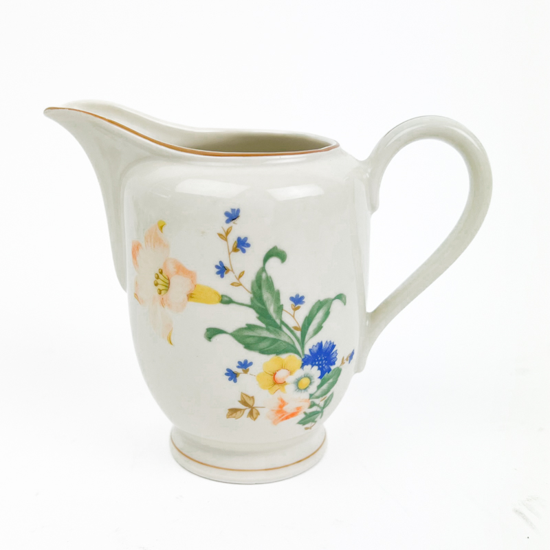 Fin vintage flødekande i porcelæn med klassisk blomsterdekoration.