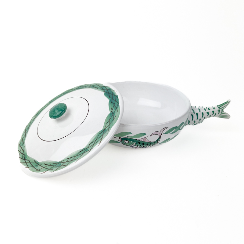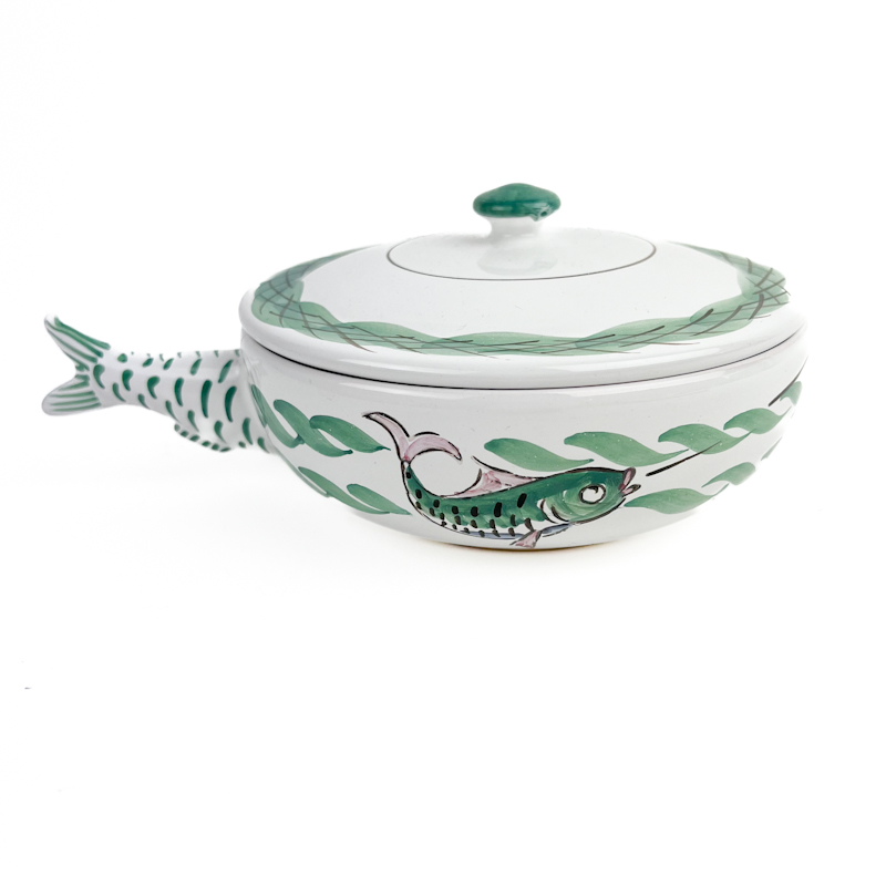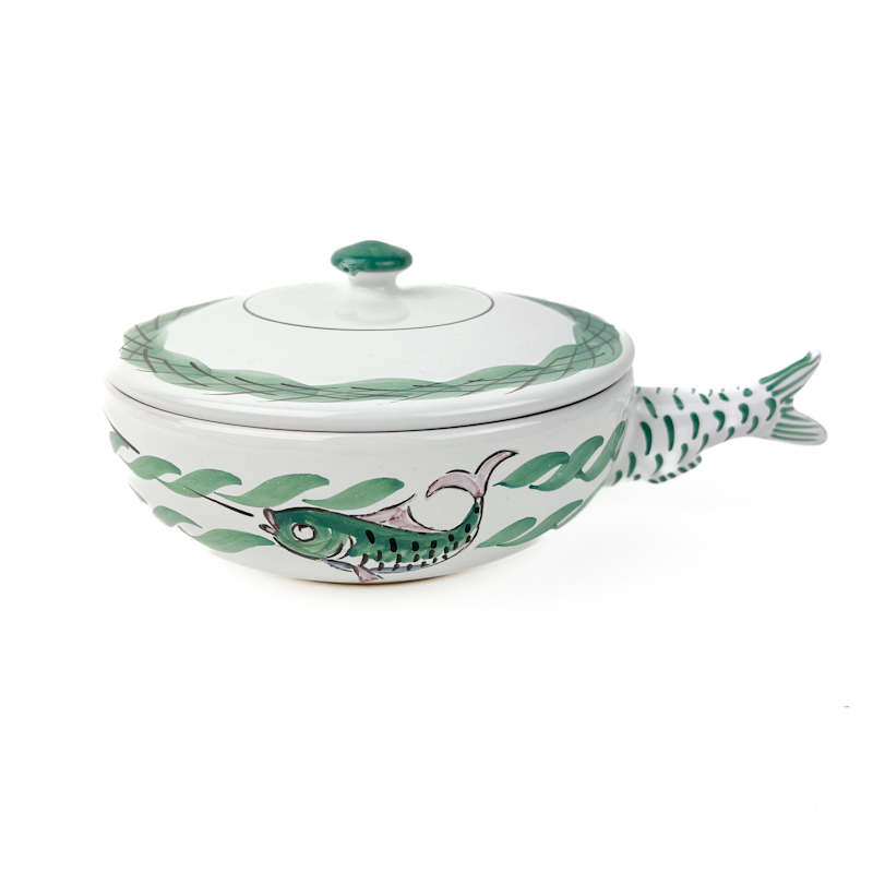 Flot retro sildeskål med låg i glaseret keramik med håndmalet fiskedekor og karakteristisk haleformet hank.