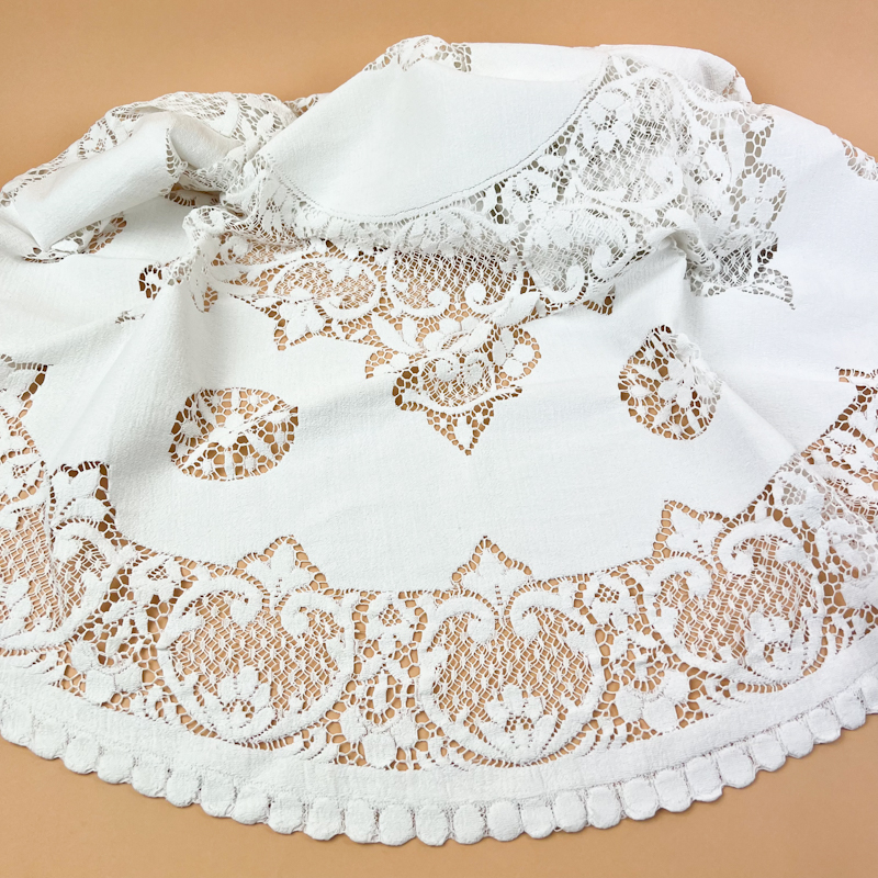 Smuk rund vintage dug i hvid tekstil med fine blondefelter og dekorativ kant.