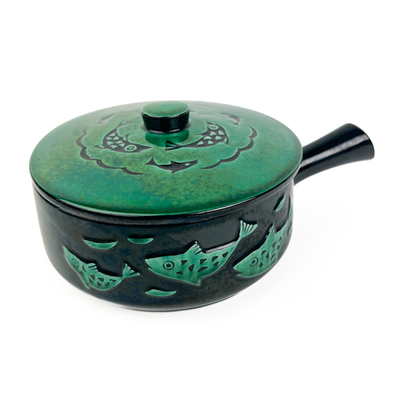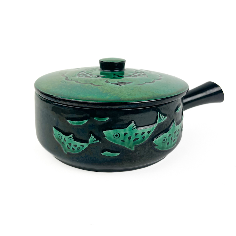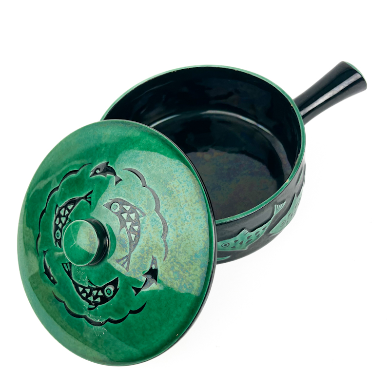 Udført i keramik med låg og integreret hank i klassisk dansk design fra midten af 1900-tallet.