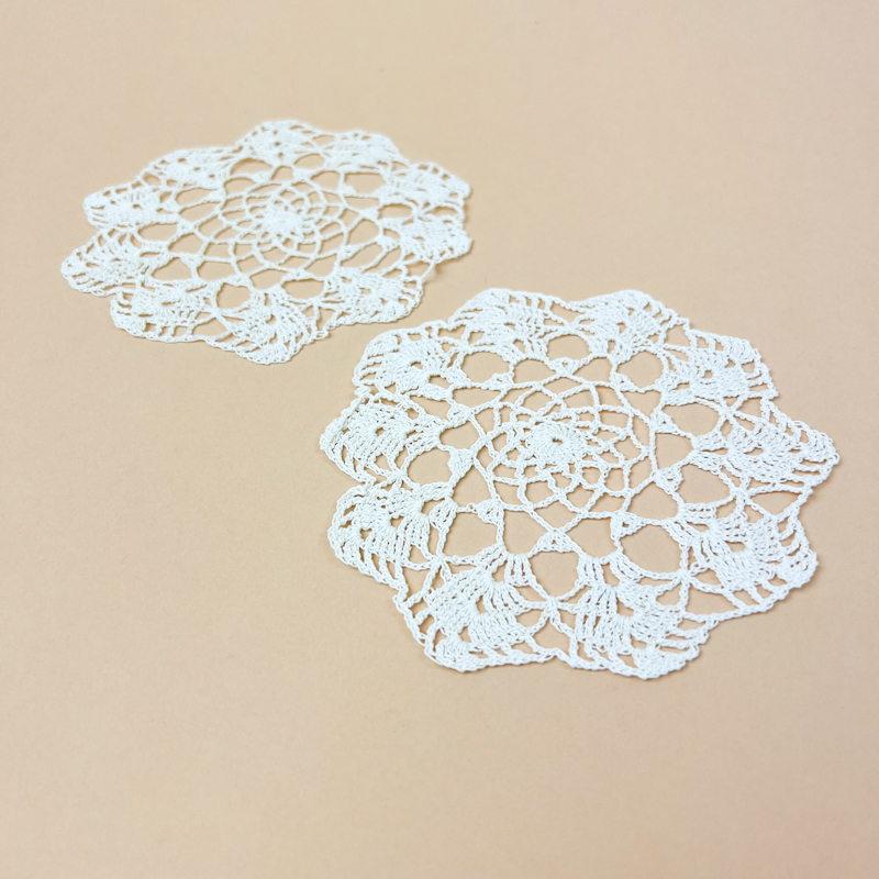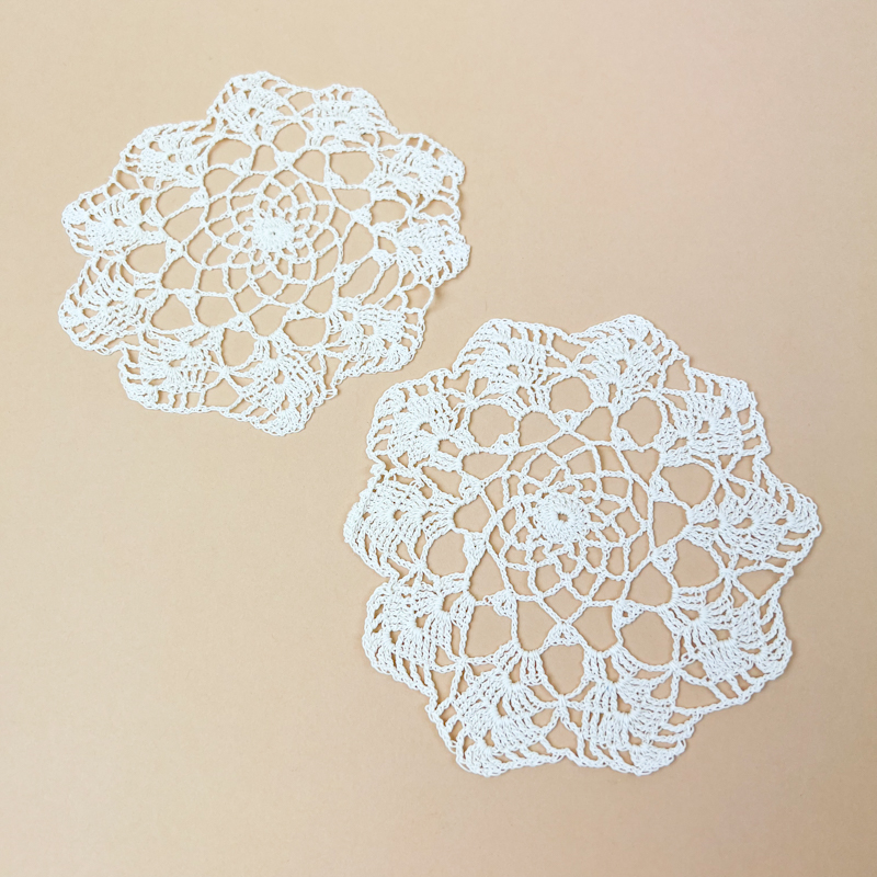 To vintage flakoner, hæklet i tyndt, råhvidt bomuld