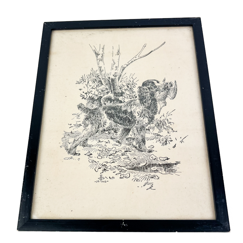 Tegning af Cocker spaniel med fugl i munden, signeret med monogram og dateret 1946.