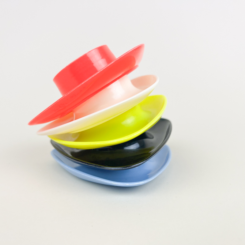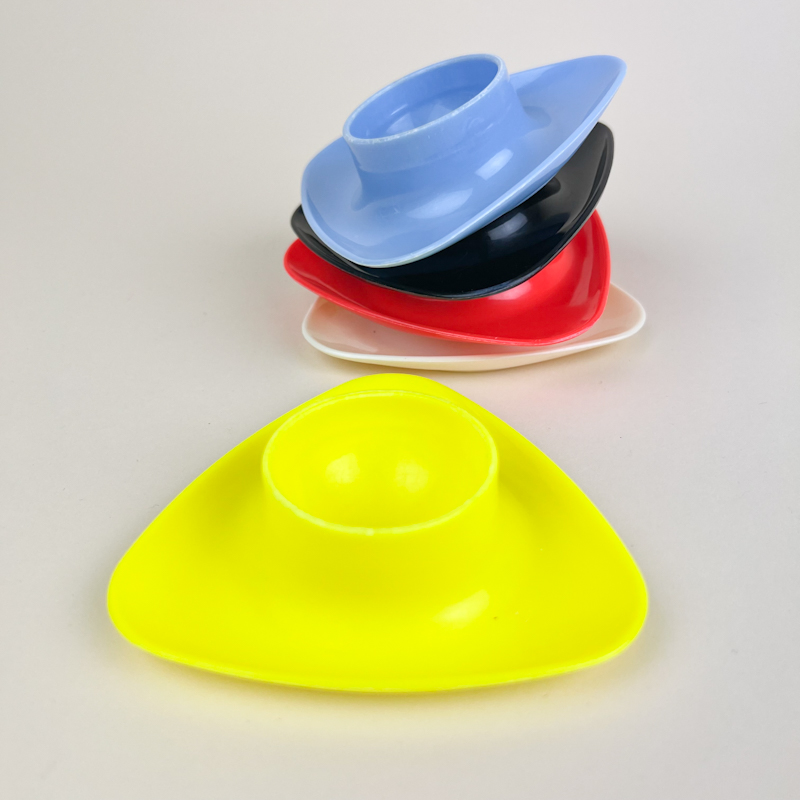 Flot sæt med fem retro æggebægre i plast i klare farver.