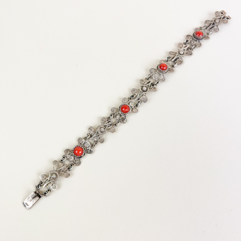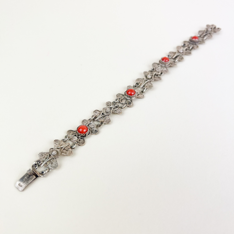 Smuk vintage armlænke i 830S sølv med fine filigran detaljer og røde koralsten.