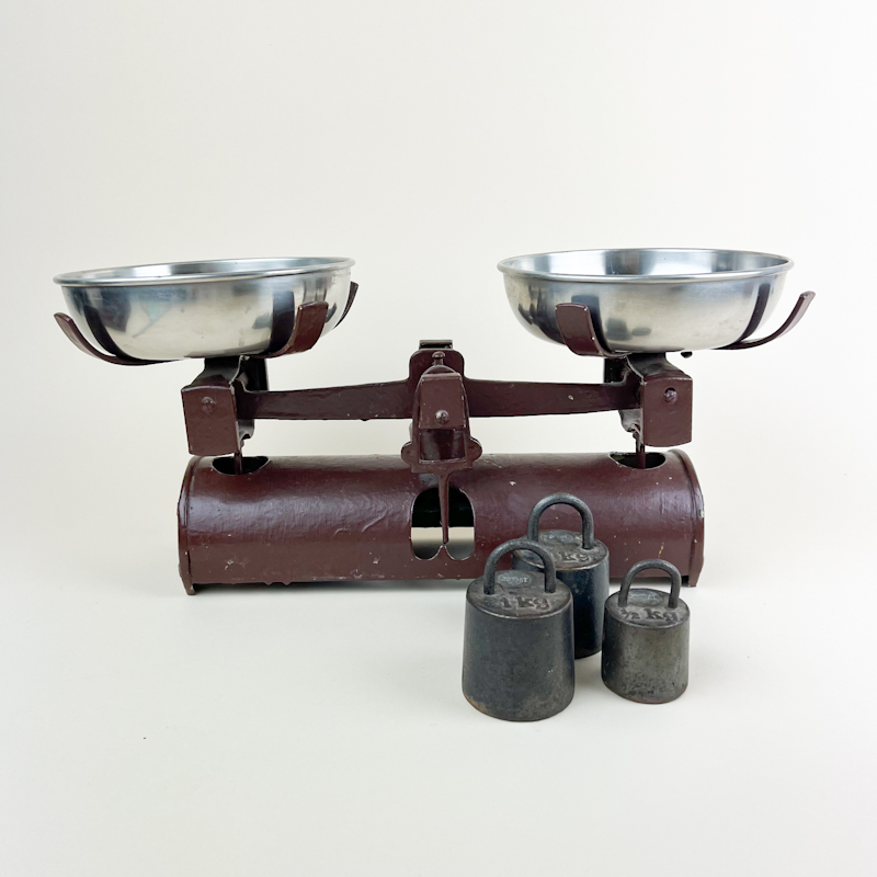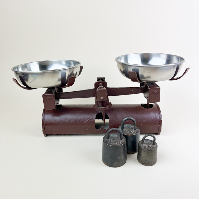 Flot retro køkkenvægt i metal med originale skåle og tre lodder.