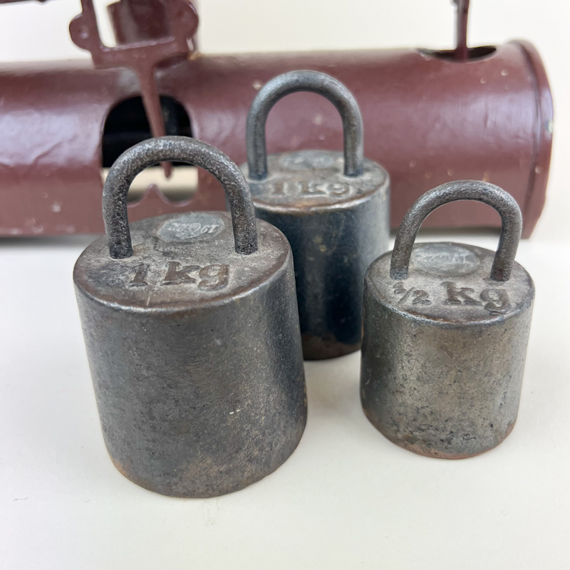 Medfølgende lodder på 2 stk på 1 kg og 1 stk. på 0,5 kg giver et komplet og funktionelt sæt. Lodderne er stemplet i 1922