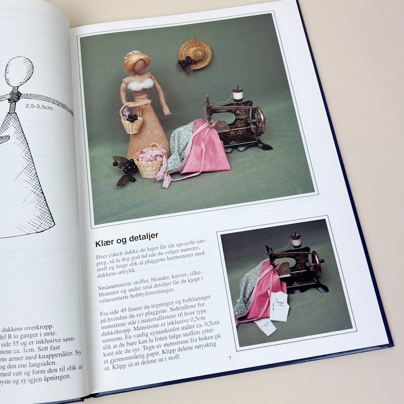 Bogen indeholder trin-for-trin vejledninger, tegninger og skabeloner til fremstilling af dukker og tilbehør.