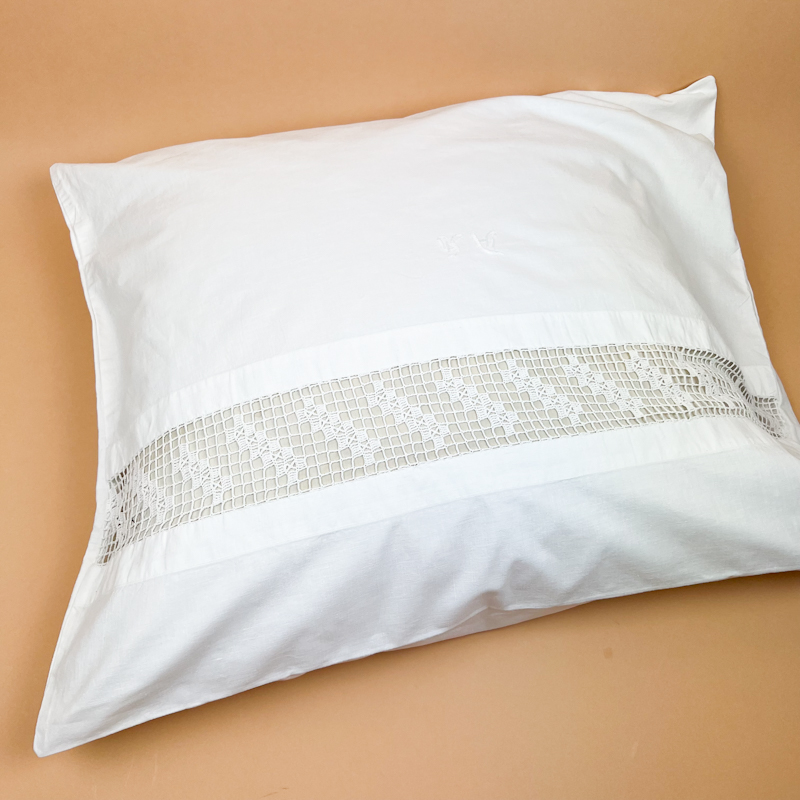 Smukt vintage pudebetræk i hvid tekstil med fint mellemværk og lille diskret monogram.
