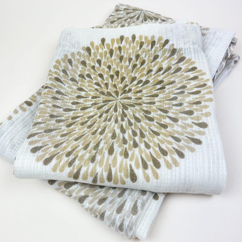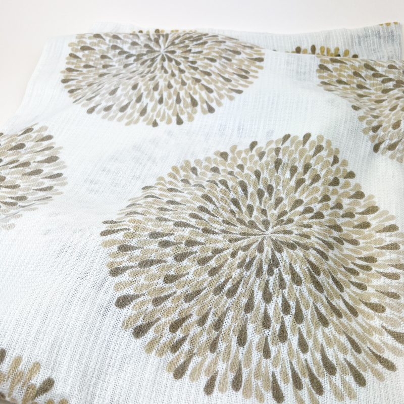 Flotte retro gardiner fra 70’erne i to fag med dekorativt mønster i beige og gyldne nuancer på lys bund.