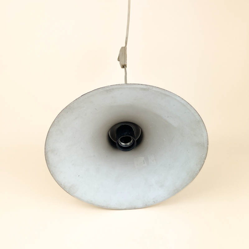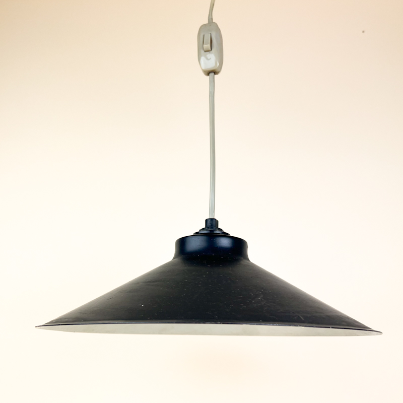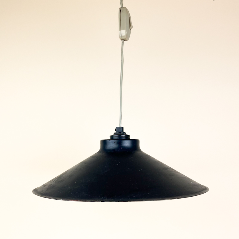 Klassisk retro pendel i sort metal med bred skærm og funktionelt industripræg.