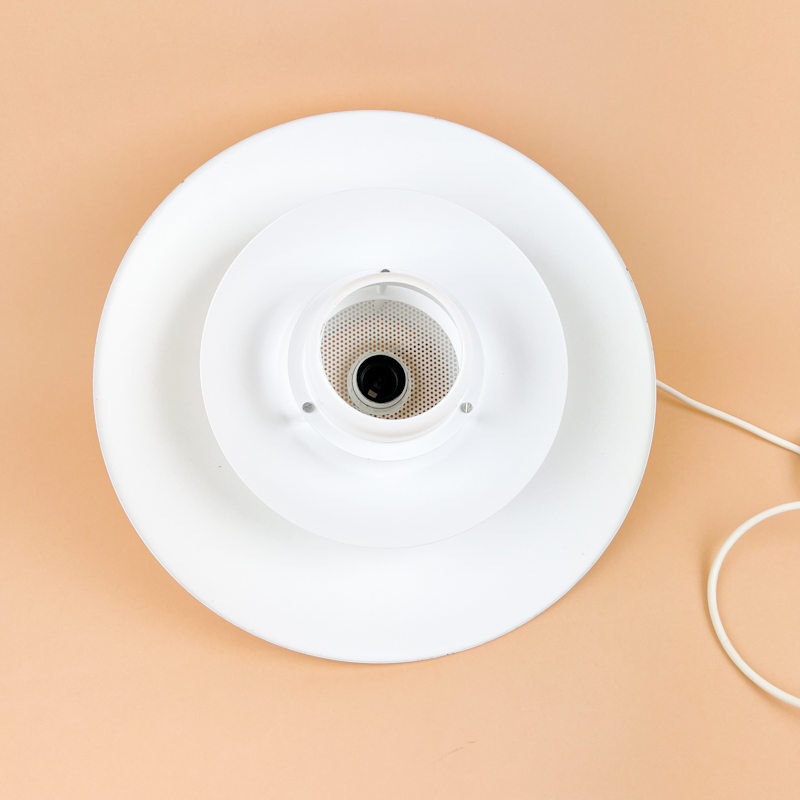 Udført i hvidlakeret metal med klassisk flerlags skærm, der giver et roligt og jævnt lys.