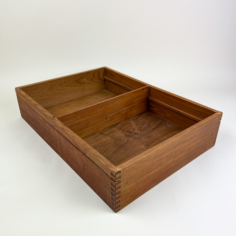 Flot retro opbevaringskasse / skuffe i teaktræ med synlige fingertappede samlinger.