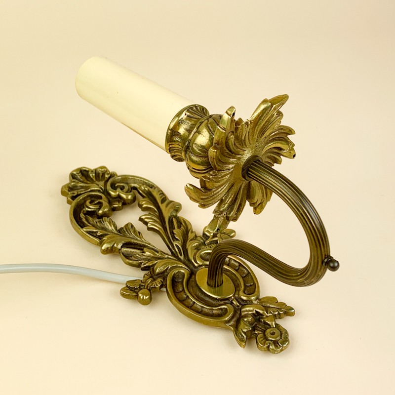 Flot vintage væglampe i messing med rigt ornamenteret bagplade og buet arm.