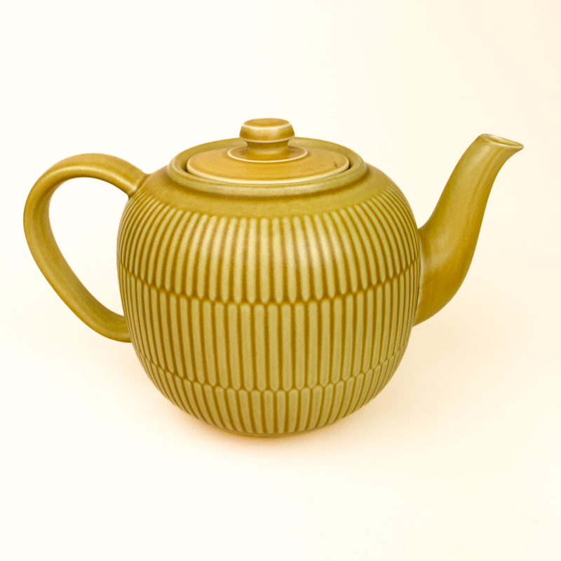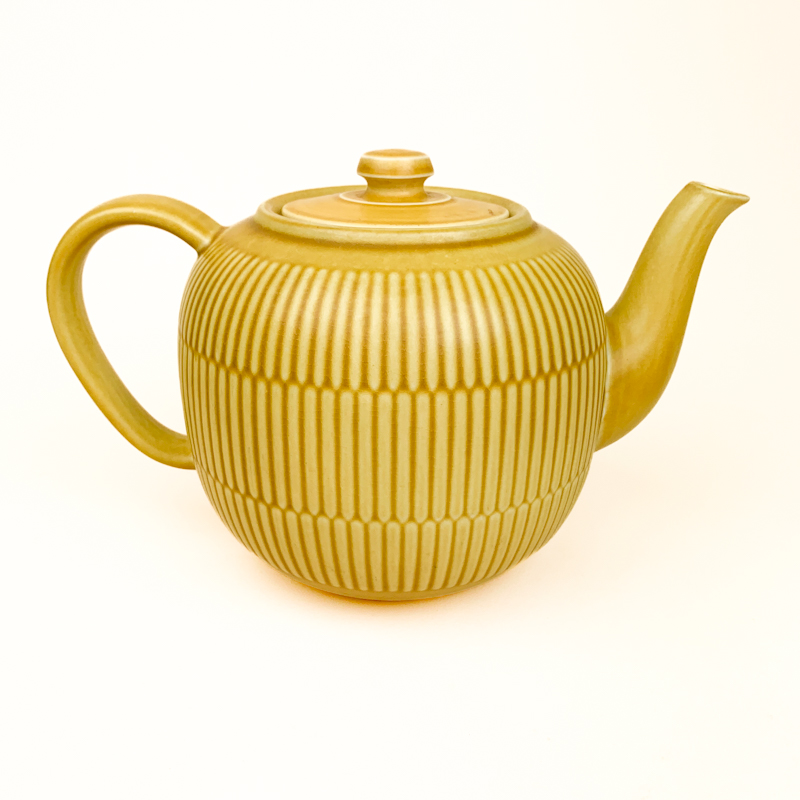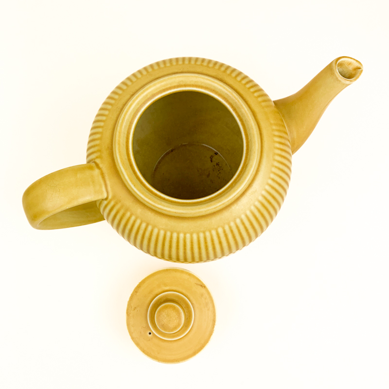 Fremstillet i glaseret fajance med karakteristisk riflet struktur og varm gul glasur fra 1940’erne.