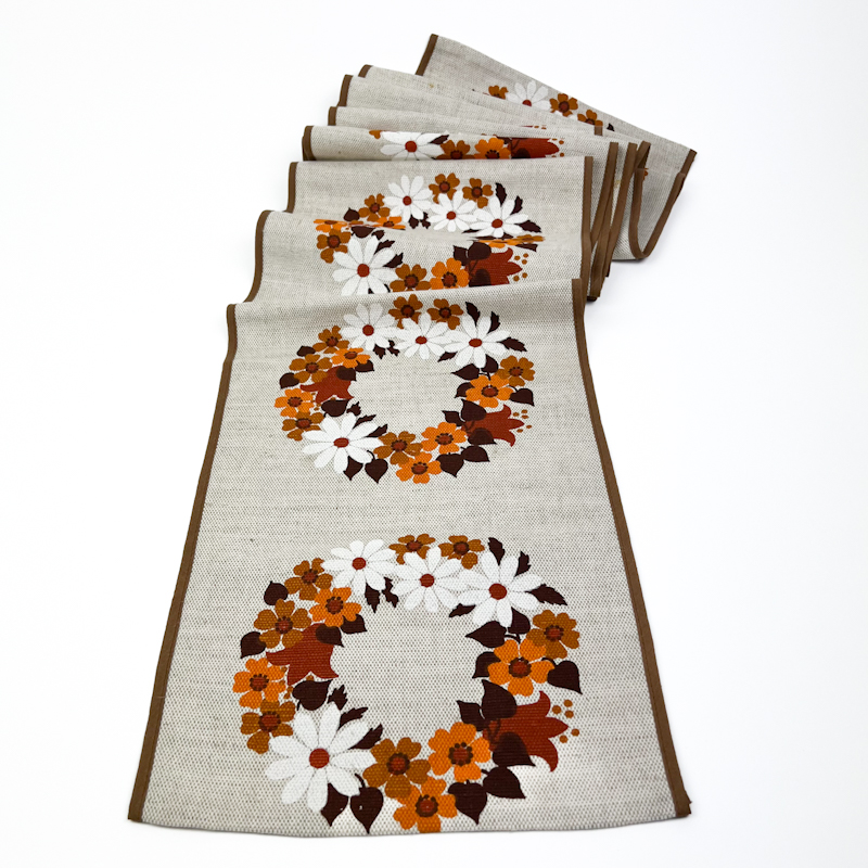 Smuk retro bordløber i kraftig tekstil med karakteristisk blomsterkrans i varme orange, brune og hvide nuancer.