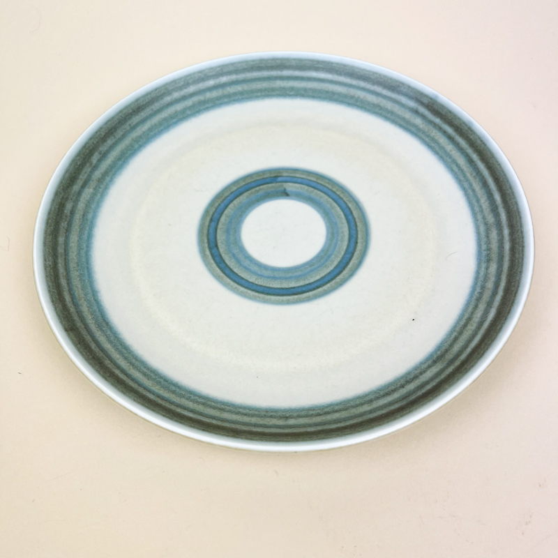 Fremstillet i stentøj med mat lys glasur og karakteristiske blå cirkler i kanten og midten.