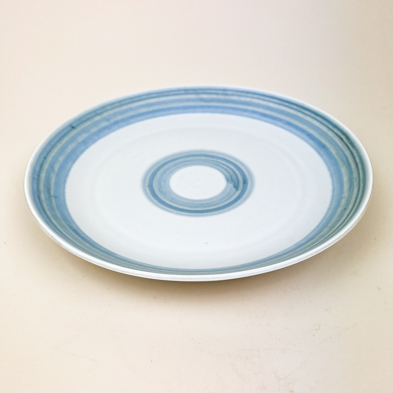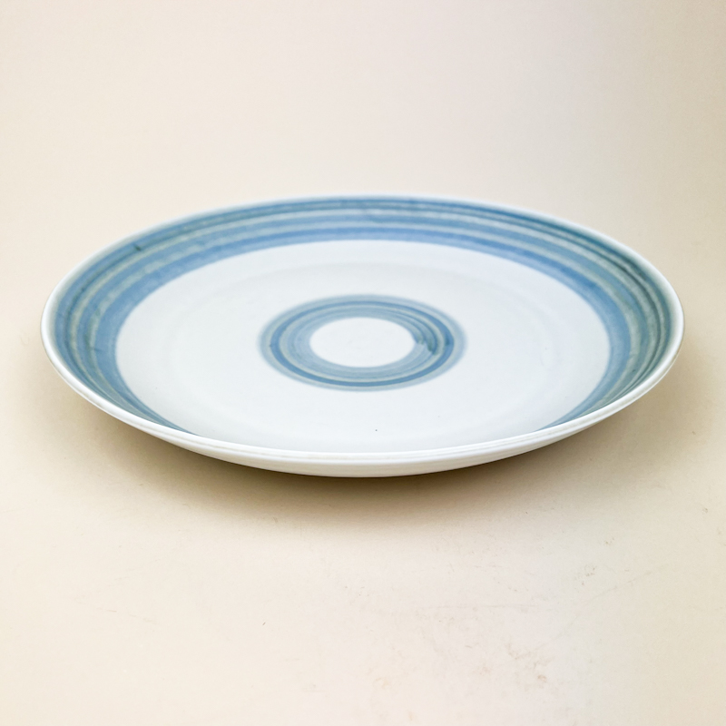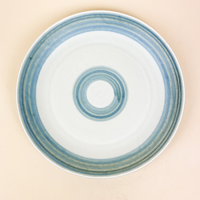 Fremstillet i stentøj med lys glasur og karakteristiske blå cirkler langs kanten.