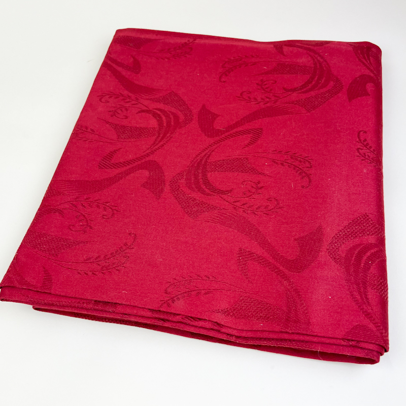 Retro dug i rød damaskvævet bomuld med elegant tone-i-tone mønster.