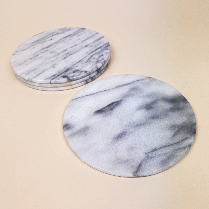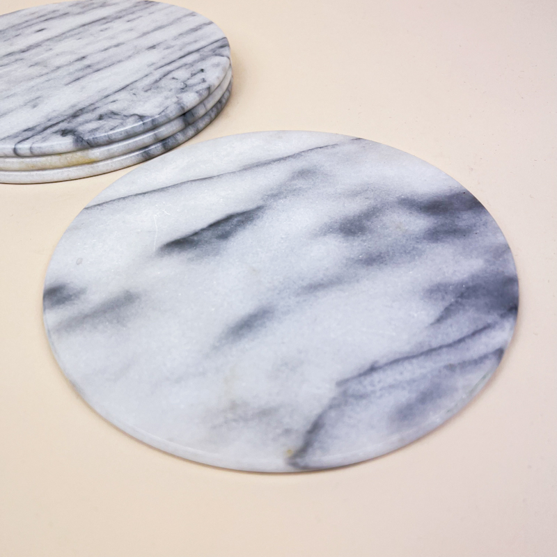 Flot sæt med fire vintage smørbrikker i ægte marmor med naturlige grå årer.