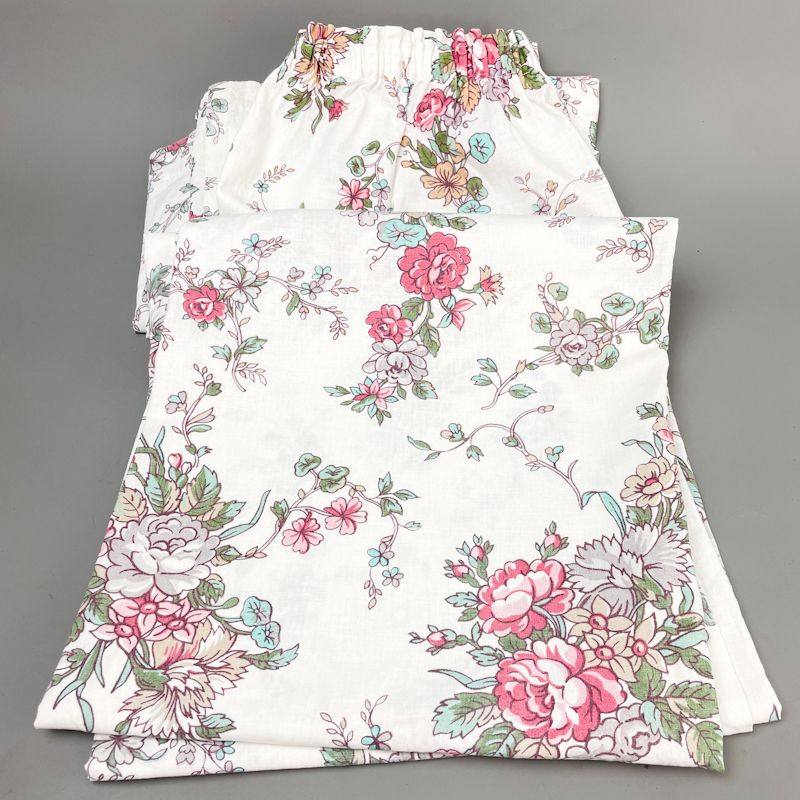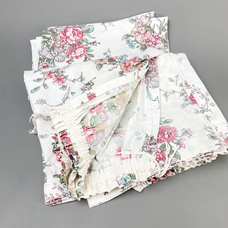 To vintage gardinfag i ren bomuld med smukt blomsterprint i bløde rosa, grønne og turkise nuancer.