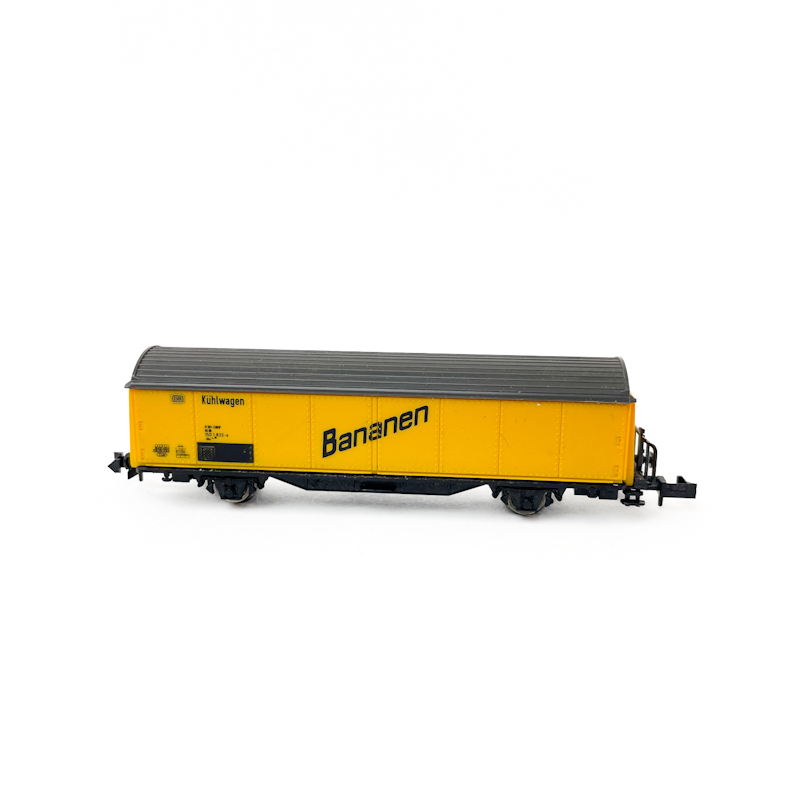 Gul vintage kølevogn i N-skala med Banenen-tryk og gråt buet tag.